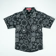 Add a modern touch to your wardrobe with this short-sleeve shirt featuring a bold geometric circle print in white on a sleek black background.