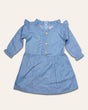 this beautiful denim dress in light blue boasts a frilled neckline, placket and sleeves with show buttons in front along with frilled sleeve hem to give your princess a smart look. it is easy to wear with a zip at the back.