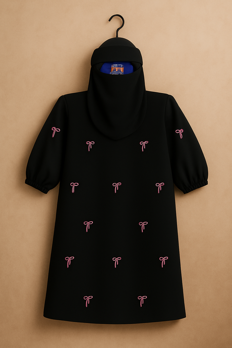 Elegant Black Abaya with Matching Niqab – Pink Bow Embroidery