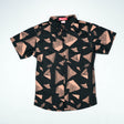 اس مختصر بازو والی قمیض کے ساتھ ایک جرات مندانہ فیشن بیان بنائیں جس میں سیاہ پس منظر پر مٹی کے رنگوں میں ایک تجریدی جیومیٹرک پرنٹ نمایاں ہو۔