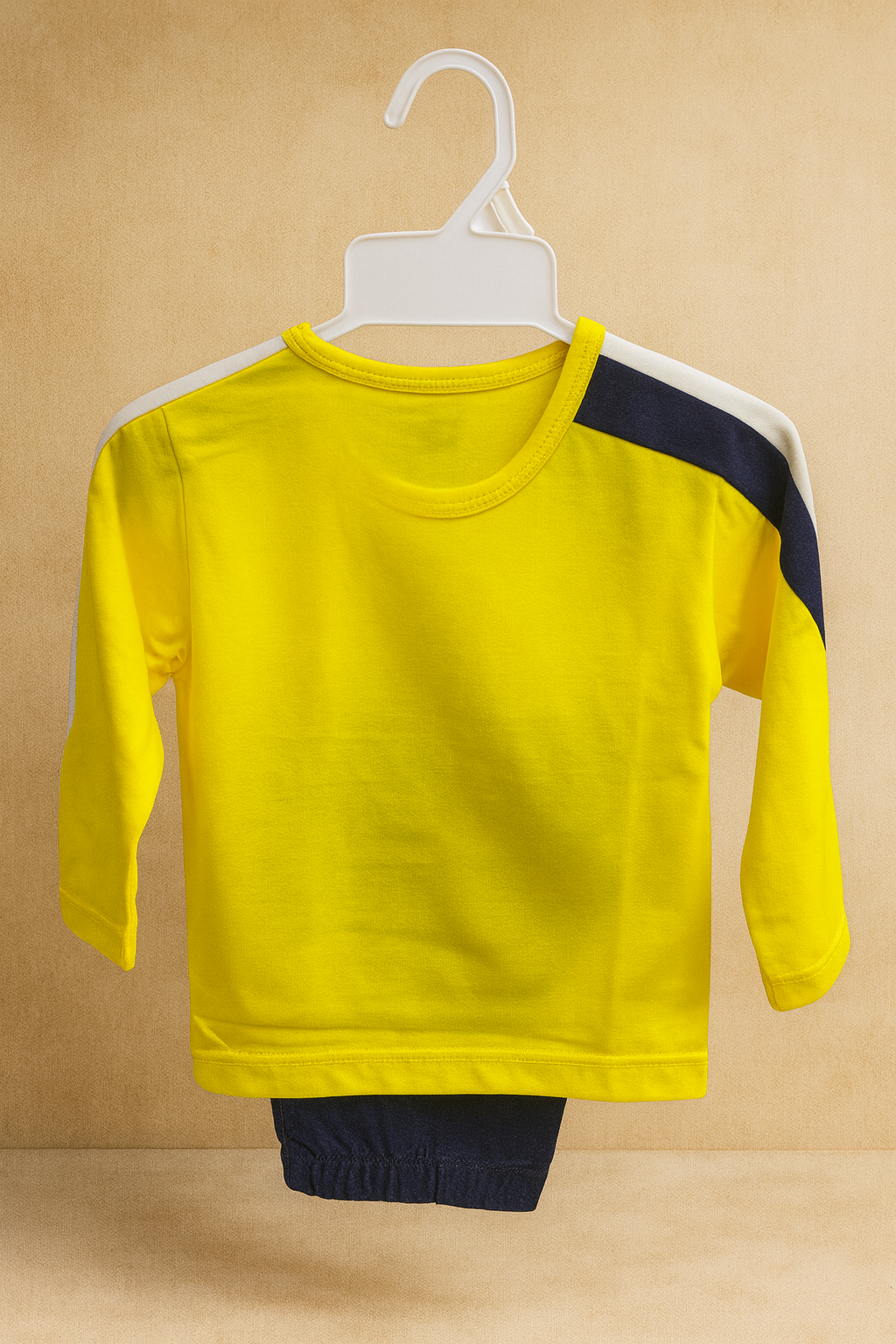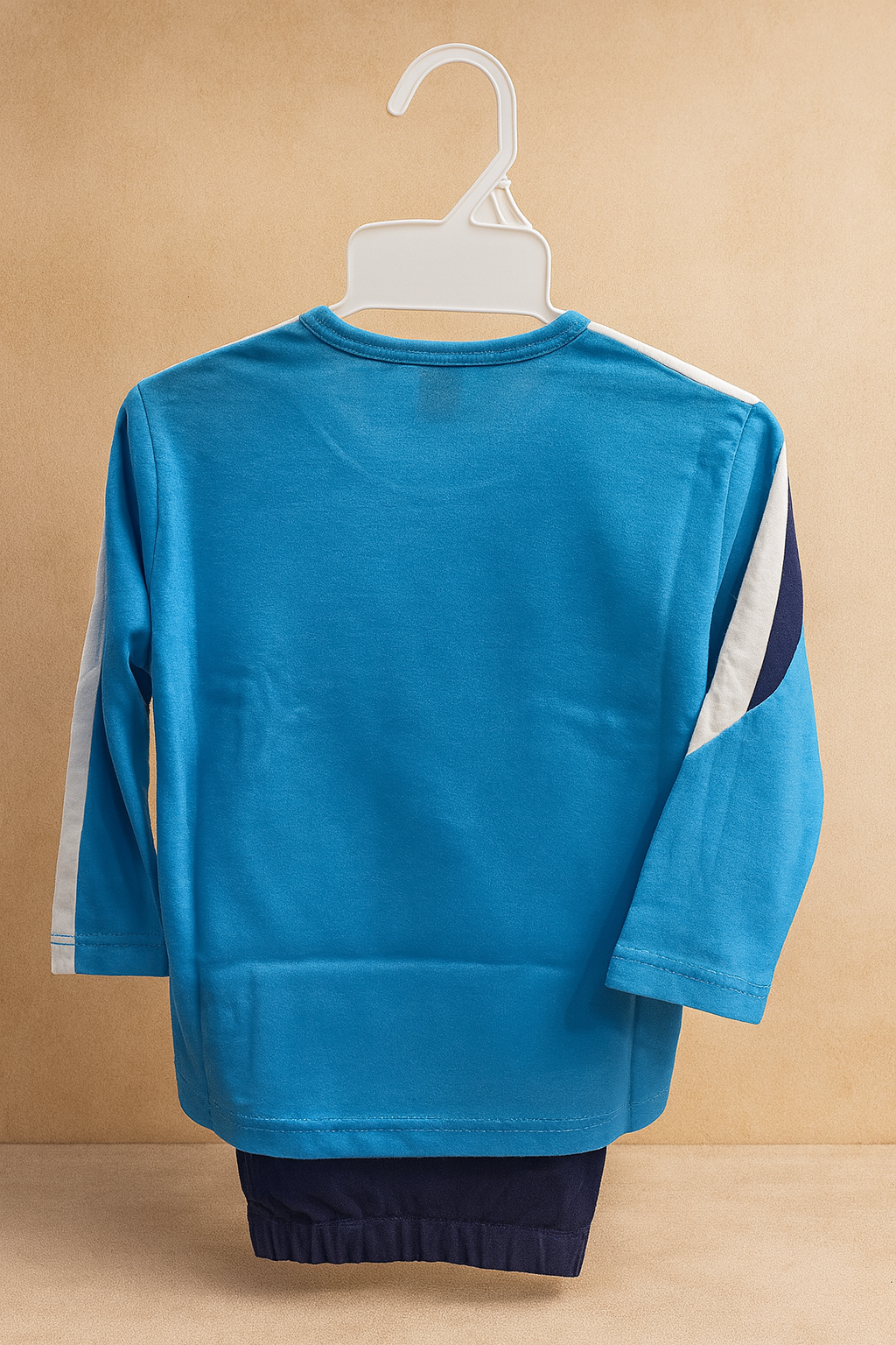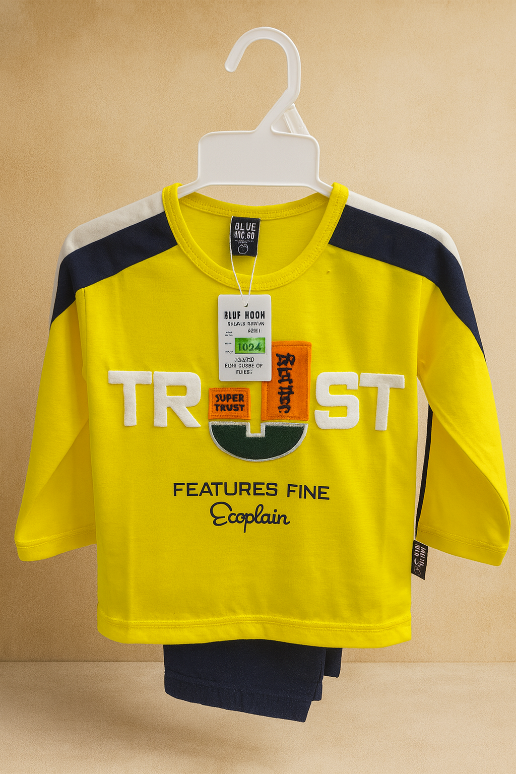Cool and comfy boys tracksuit featuring a long-sleeve sweatshirt with bold Trust print design on the front. The sweatshirt comes with sporty shoulder stripes, paired with matching jogger pants for a casual yet stylish look. Made for comfort and durability, this set is perfect for active kids, daily wear, or casual outings. A trendy outfit that balances fashion with functionality.