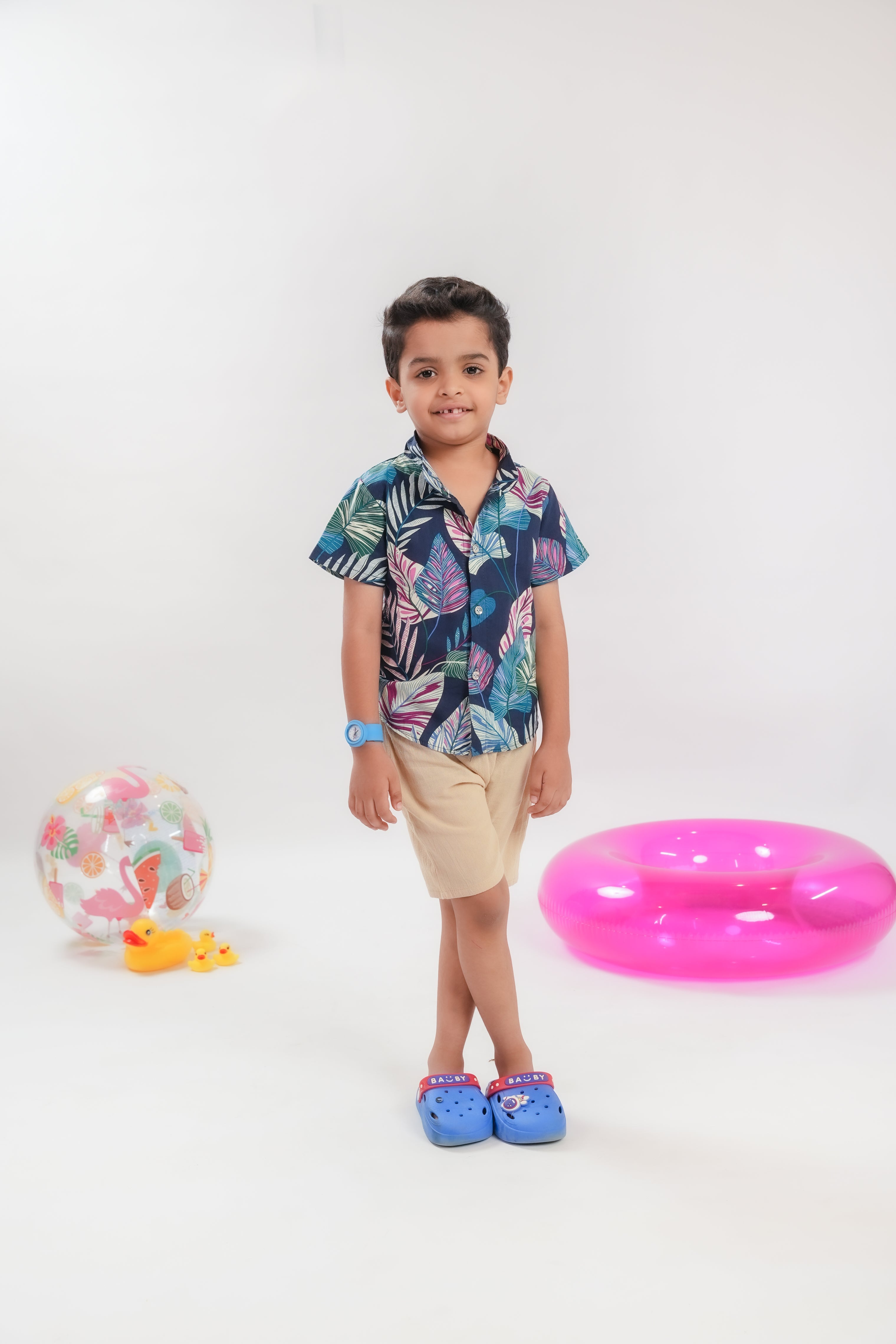 - The shirt features a vibrant blue Hawaiian print, paired with beige shorts for a fresh and summery look.