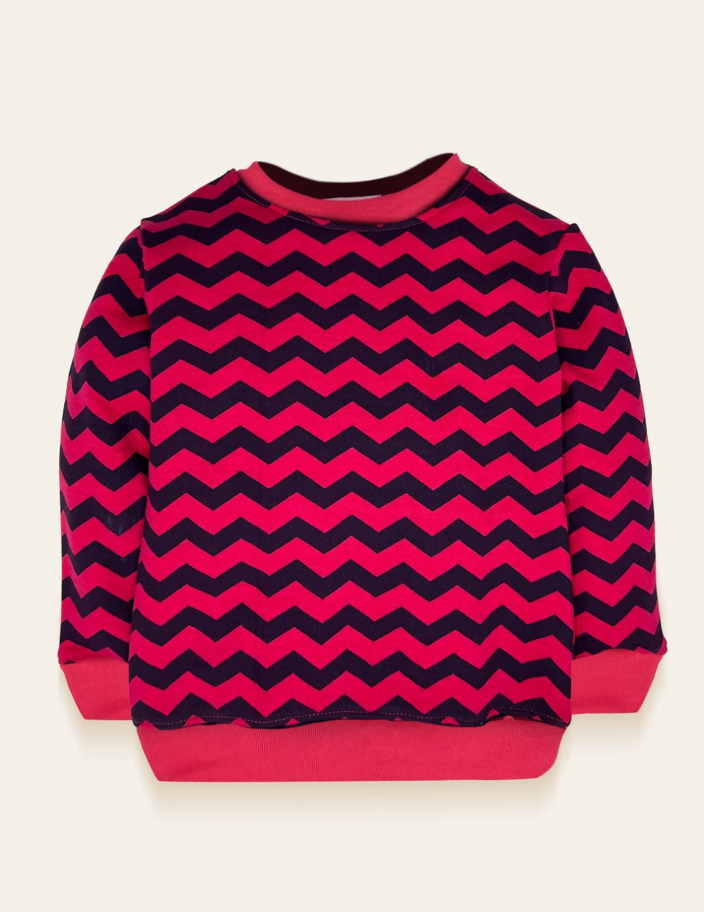 This zigzag patterned sweatshirt in fuschia french terry with navy contrast will keep warm and cozy with an elegant look.